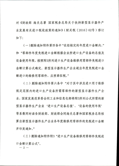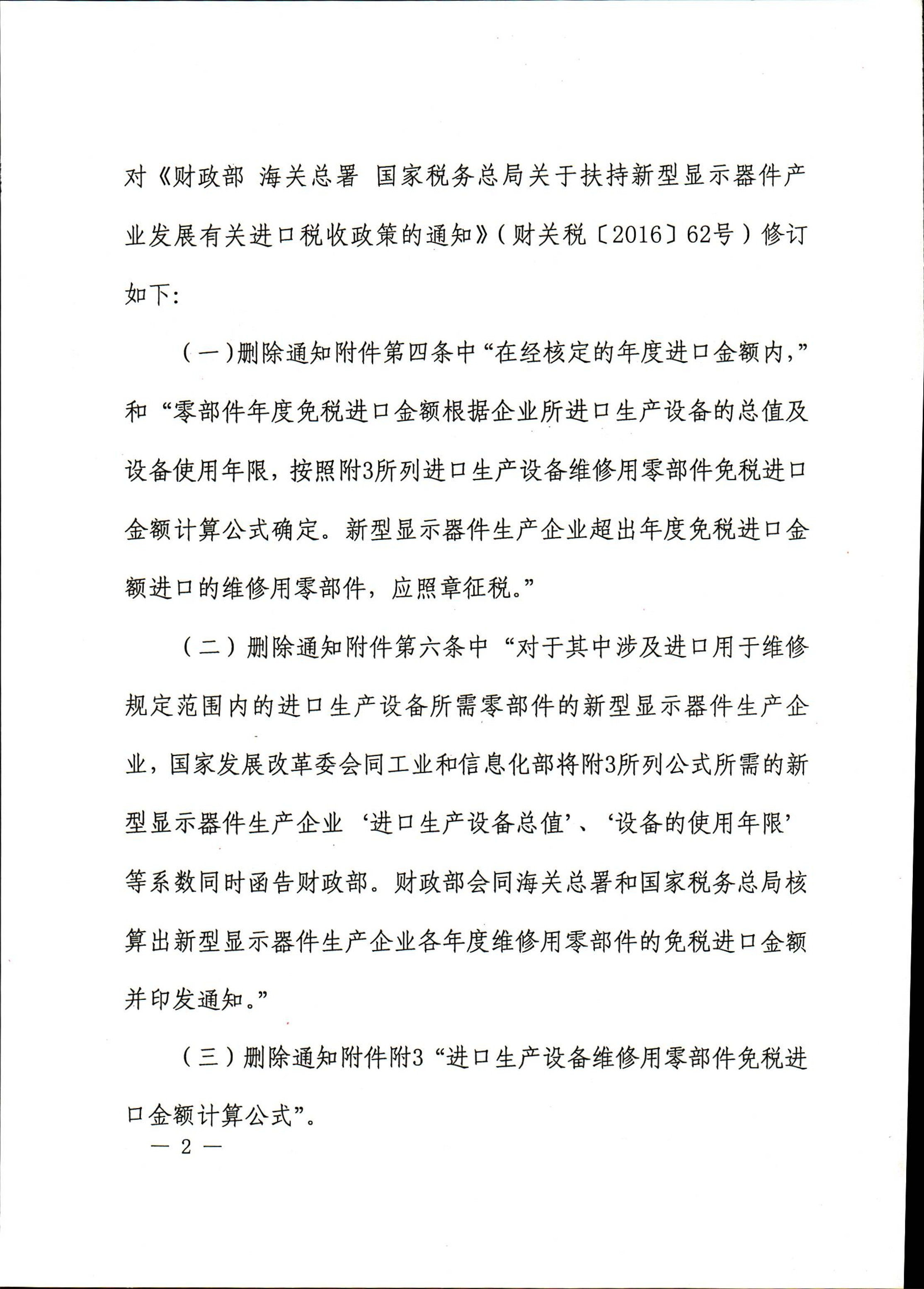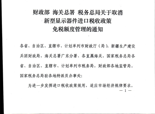 关于取消新型显示器件进口税收政策免税额度管理的通知