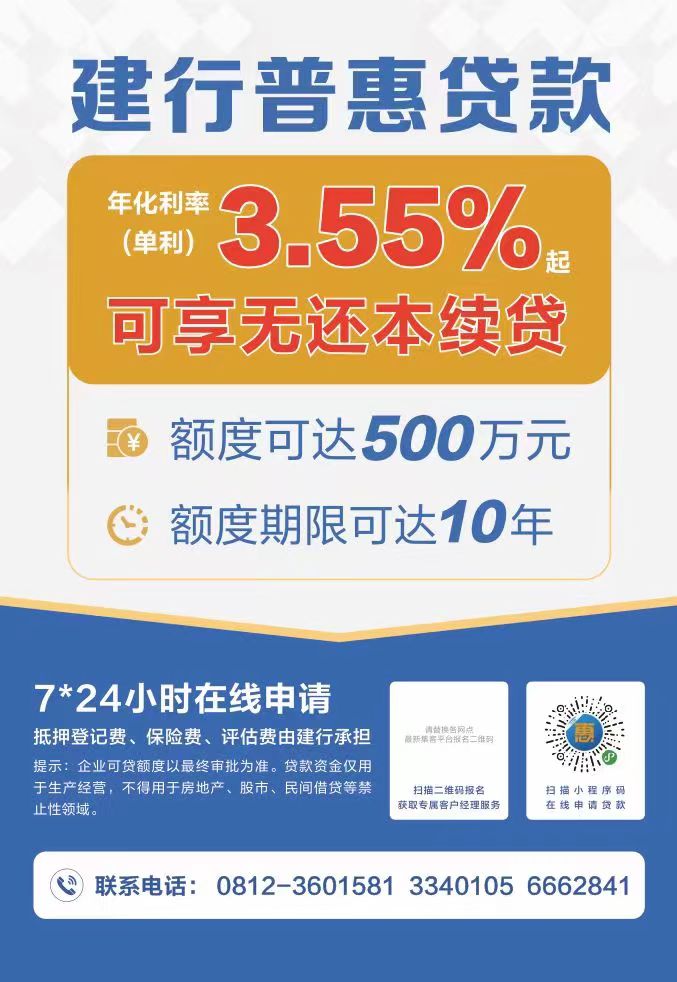建行攀枝花分行最新推出了普惠贷款,年化利率(单利)3.55%起,可享受无还本续贷,额度可达500万元,额度期限可达10年。
